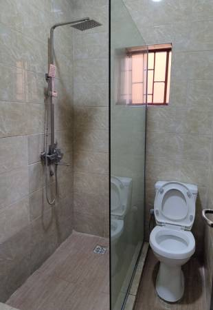 Modern walk in shower unit, with mirror and plenty of hot water with fresh towels.